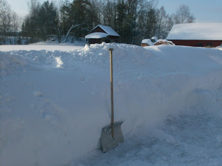 Frågan är nu skall snön få ligga där den ligger på gårdsplanen för den lär bli tungskottad och får den ligga och minusgraderna är borta ersatts med plusgrader som hoppas stanna några dagar lär mildvädret få kretsloppet att sköta sig själv.